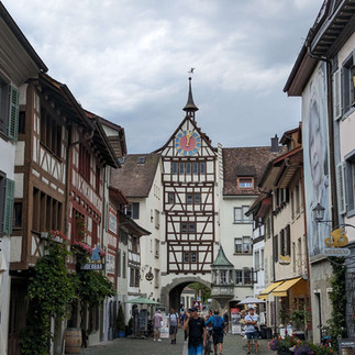 Leaving the church we decided to ride over the covered bridge to buy some groceries in Switzerland. Why? Because we had an abundance of Swiss Francs to offload. Even though groceries are more expensive in Switzerland it is a better return on investment than holding Swiss Francs in a momento jar.