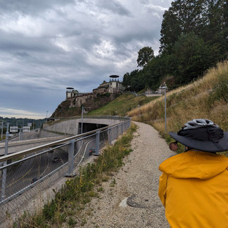 We stopped to eat some lunch and the clouds began to gather. I asked Sarah to check the weather app and it showed no rain but my eyes were telling me a different story. We decided to start preparing for rain by putting on the pannier rain covers, rain jackets, tent cover, handlebag covers and shoe covers. It was quite a task since we weren't expecting it and most of those items had been buried deep in our packs. Remember, we are supposed to trust what the experts tell us and ignore what our eyes can see. It rained. Thankfully it was not a drenching rain and it eventually cleared up.